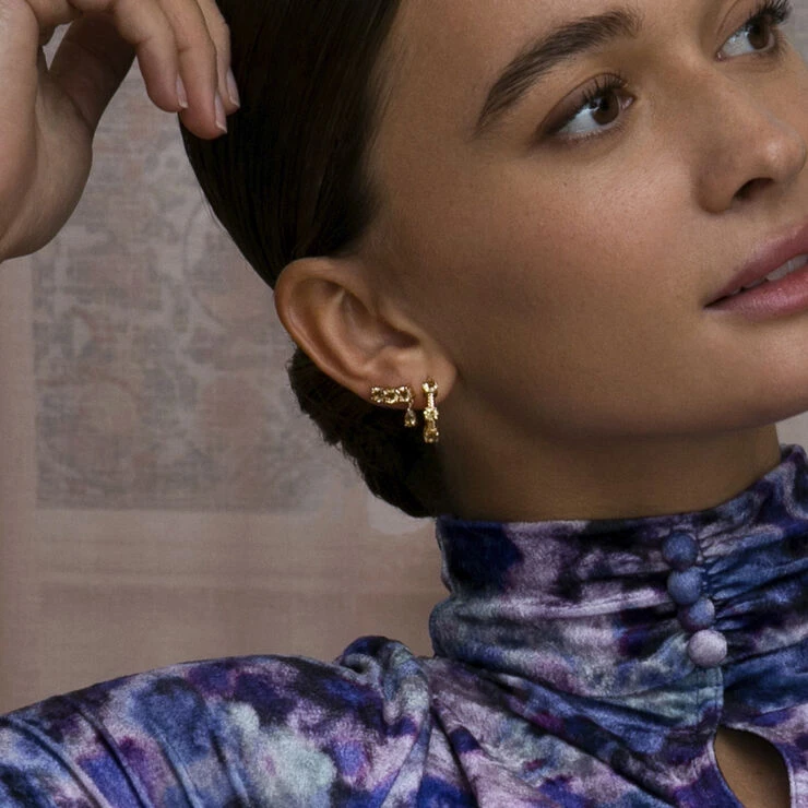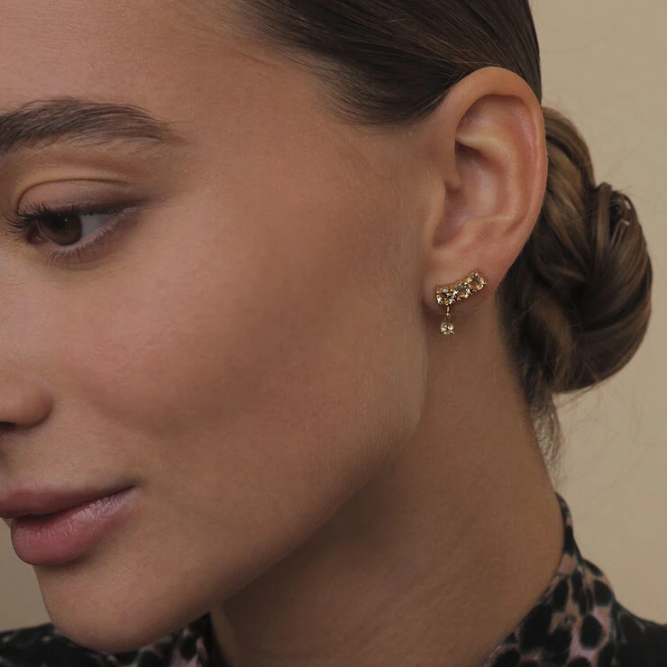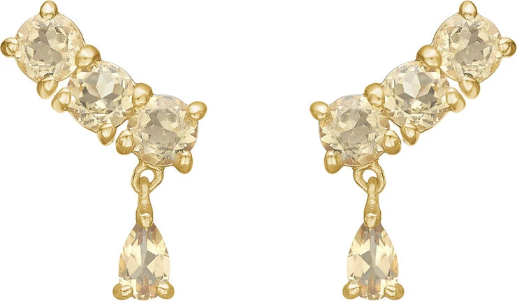 Ørestikker med rund og pæreslebet Champagne Kvarts. De er fremstillet i sterling sølv og belagt med 18 karat guld. Ørestikkerne tilhører Olalla kollektionen inspireret af Karen Blixens fortælling om Olallas perfekte, men uopnåelige kærlighed.