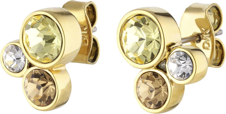AKI er en lille sød og feminin ørenstik med en trio af funklendekrystal sten, her vist i gyldne toner på en basis af guld. Stikken er lavet i kirurgisk stål, Dansk design. Fri for nikkel, bly og cadmium.