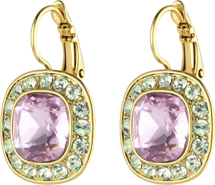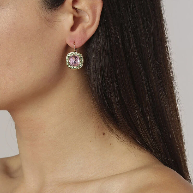 CELIN – en meget spændende og nytænkt dog klassisk ørenring, der virkelig står frem ved det at stensætningen er så spændende.Ørenkrogen er produceret i kirurgisk stål, mens selve smykkets materiale er messing der har fået en meget holdbar plattering / belægning. CELIN, der er dansk design, allergistestet og nikkelfri er naturligvis designet af DYRBERG KERN og her vist i smukke lys grønne og rosa toner på en guldtonet baggrund.