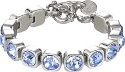 CONIAN – En ægte bestseller – og et armbånd der virkelig drager opmærksomhed: CONIAN er et af vores mest markante tennisarmbånd med større Swarovskikrystaller. Her vist i sølvguldtonet finish og klare lyseblå krystaller. – Nikkelfri – Rustfrit stål – Lås: Fjederlås