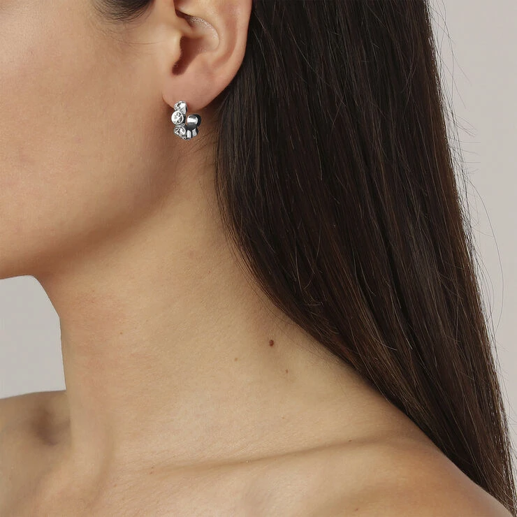 JENNA – creol ørering rigt dekoreret med facet skårne runde krystaller, som ses både forfra og delvis bagfra. Designet i poleret messing med guldtonet finish. her vist i en klar krystal og sølvtonet version. Låsen er af kirurgisk ædelstål. Dansk design – fri for bly, nikkel og cadium.