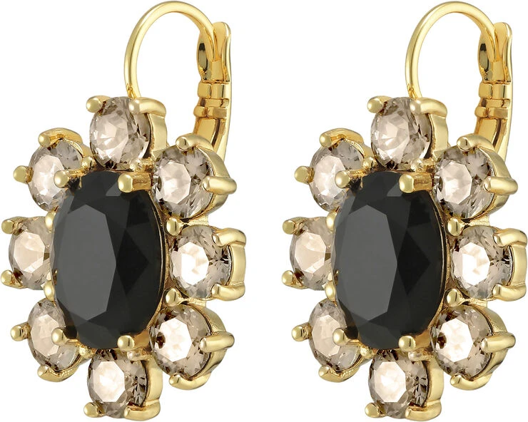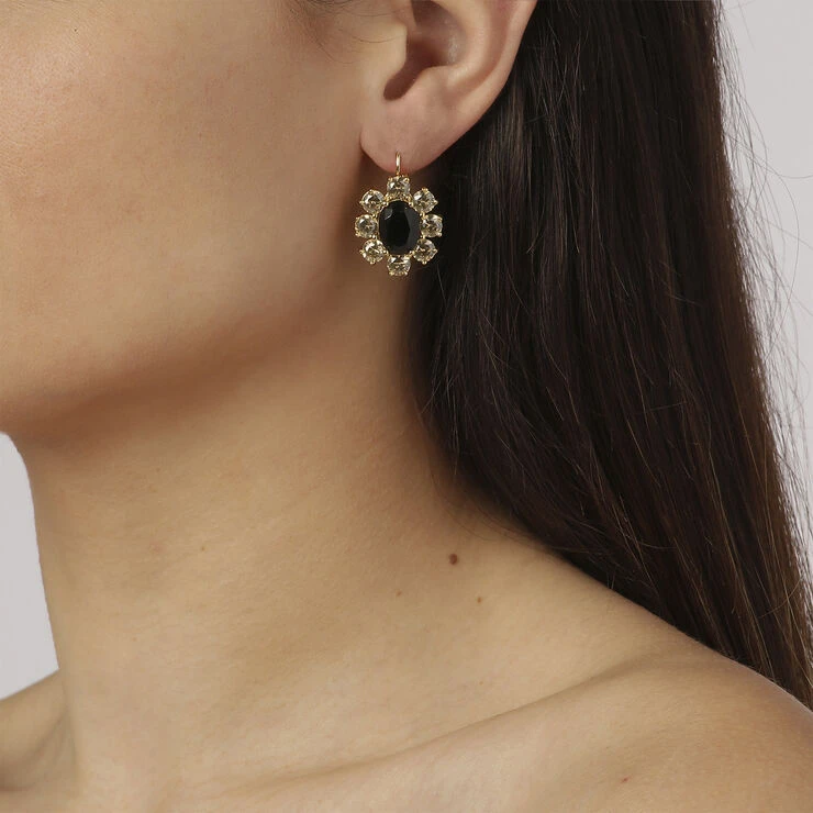 VALENTINA er en moderne og romantisk ørenring med lukket ørekrog. Det smukke ovalt formede vedhæng i facetteret krystal glas er omkranset med en smuk række af mindre sten i kontrastfarve og sat i en let fatning. Her vist i guldtonet og smukke lyse gyldne og dramatiske sorte toner. Smykket er designet i poleret messing med kirurgisk stål krog. Længden er ca 30 mm. Designet i Danmark og fri for cadmium, nikkel og bly.