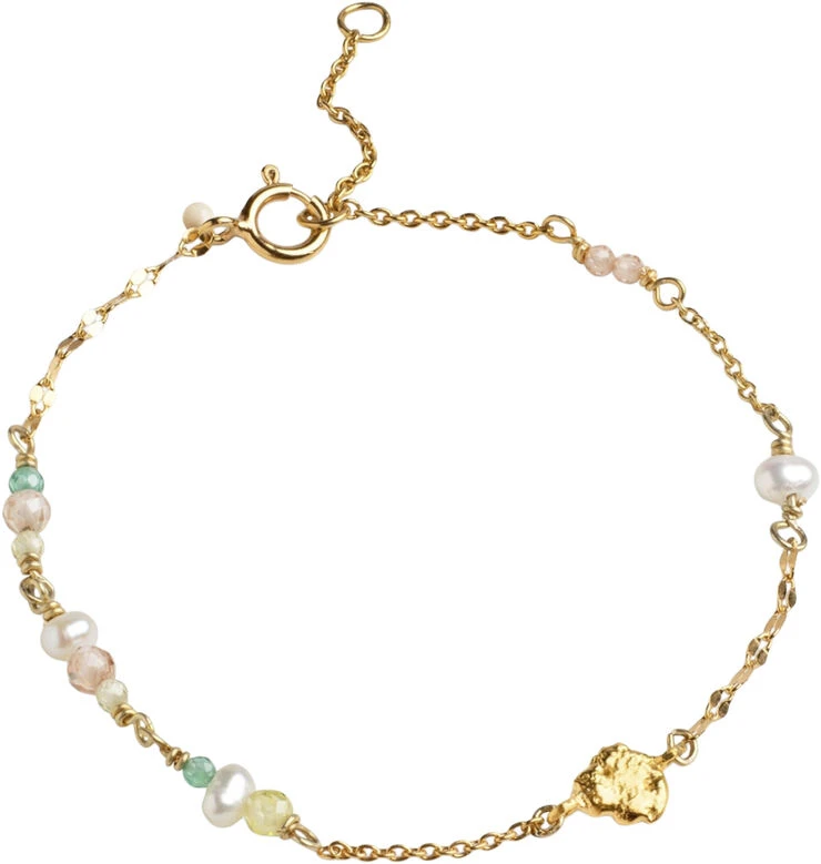 Om smykket- Vores Lucie armbånd, med dets perler og sten i grønne, ferskenfarvede og hvide nuancer, går godt i spænd med forårets farver. De rå guldelementer og Lucies asymmetriske look giver kant til dit outfit, hvor alle elementer shiner fint sammen.