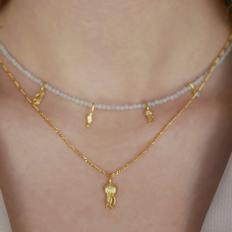 Om smykket- Aquarius halskæden er endnu en af vores skønne havdyr i form af et smykke. Vandmanden er udført i et smukt, håndlavet design med blå og hvide CZ sten. Vedhænget er sat på en af vores yndlingskæder, figarokæden. Den facetterede kæde giver kontrast, ynde og personlighed til halskæden. Aquarius er som skabt til at sammensætte med enten en af vores simple kæder, en af vores perlekæder eller en af de andre kæder med havdyr på. Find din helt egen yndlings kombination, og skab dit eget personlige og unikke look.