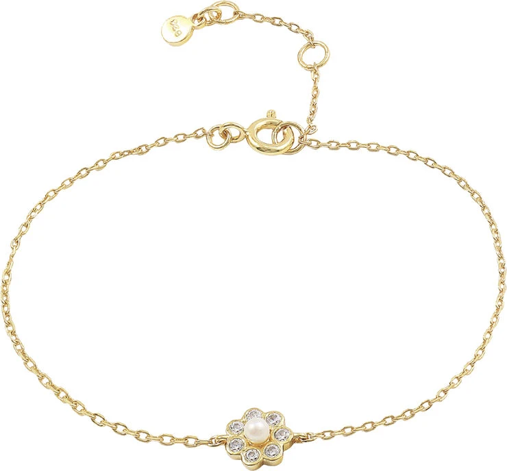 Sterling sølv forgyldt med 18 karat guld, cubic zirconia og ferskvandsperle. Længde: 16 cm + 3 cm flex