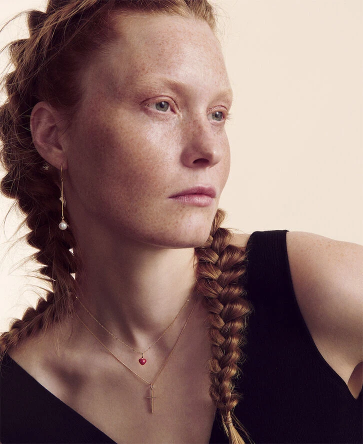 Palmediakæde med karabinlås i 18 karat guld. Halskæden fås i længderne 40 cm og 50 cm. Det tætte flet får kæden til at fremstå særligt fin og glansfuld.