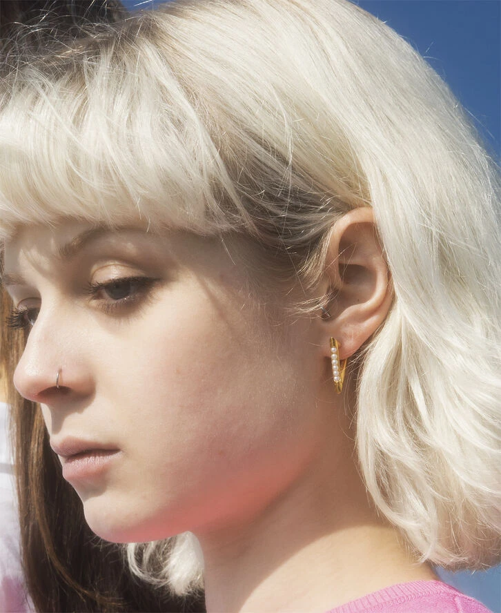 Lille trekantet ørering i sterling sølv belagt med 18 karat guld og 12 små ferskvandsperler.