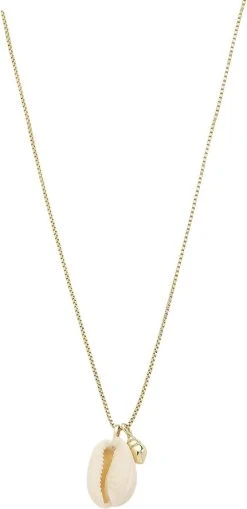 En smuk halskæde med en naturlig cremehvid musling i kombination med lille guldbelagt konkylievedhæng. Et utroligt feminint smykke, der bærer naturens fascinerende skønhed og har et elegant, afslappet udtryk. En halskæde, der minder os om skønne rejser til smukke strande. Kæden er 40 cm og har 9 cm forlængerkæde, så vedhænget ligger helt rigtigt i din udskæring.