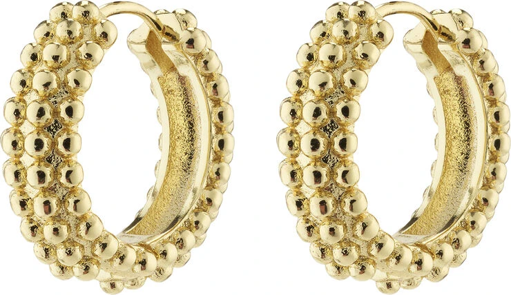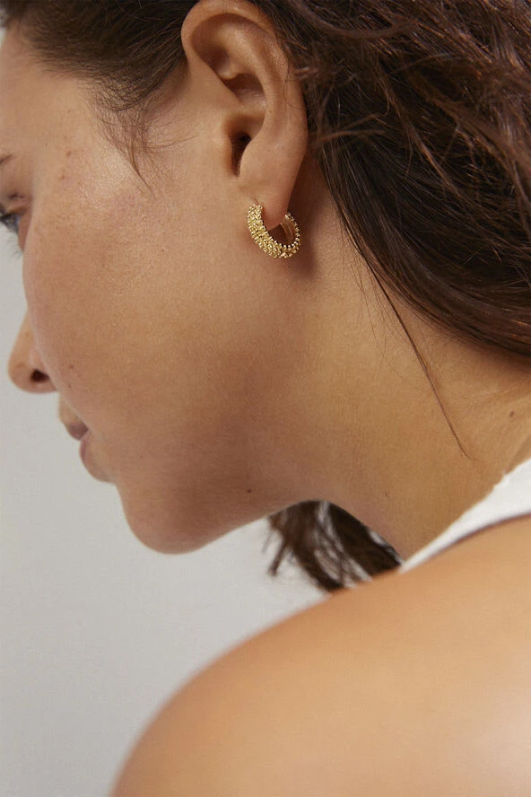 Conquer the world med de guldbelagte små Anitta-hoops, der har en energisk og playful energi. Øreringene har et voluminous design af spherical shapes, der skaber en cool og chunky vibe til de små hoops. Et sæt øreringe, der er lavet af min. 75 % recycled materiale med omtanke for miljøet.
