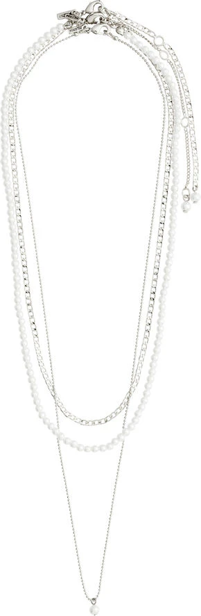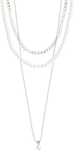Always cool to be classy! Sølvbelagt 3-i-1 halskæde fra Pilgrim med en stærk kombination af classy pearls og trendy chains. Sættet kommer med en classy perlekæde, en cool panzer-kæde og en trendy ball chain med enkelt perlevedhæng. Brug kæderne sammen eller hver for sig as you like. Et godt match til alle dine party dresses, men kan også bruges til at pifte et casual everyday outfit op. Halskæderne måler 38 cm, 40 cm og 50 cm.