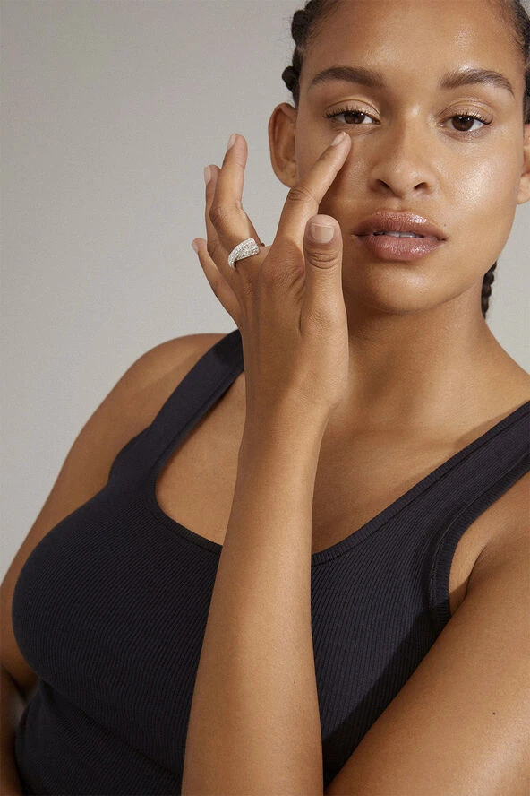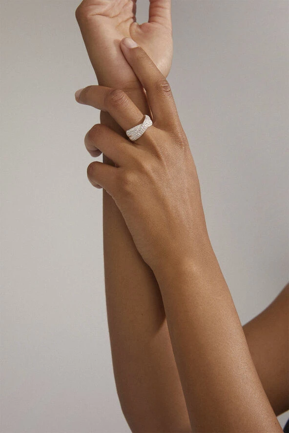 Sparks of joy! Den sølvbelagte Edtu-ring er dækket af små Preciosa-krystaller, som instantly tilføjer ekstra shine og glamour vibes til dit outfit. Ringen har en fin crossover-detalje på fronten, der giver designet en lækker 3D-effekt. Husk: Sparkles go with everything så tag dit nye favourite item på and glam up your day.