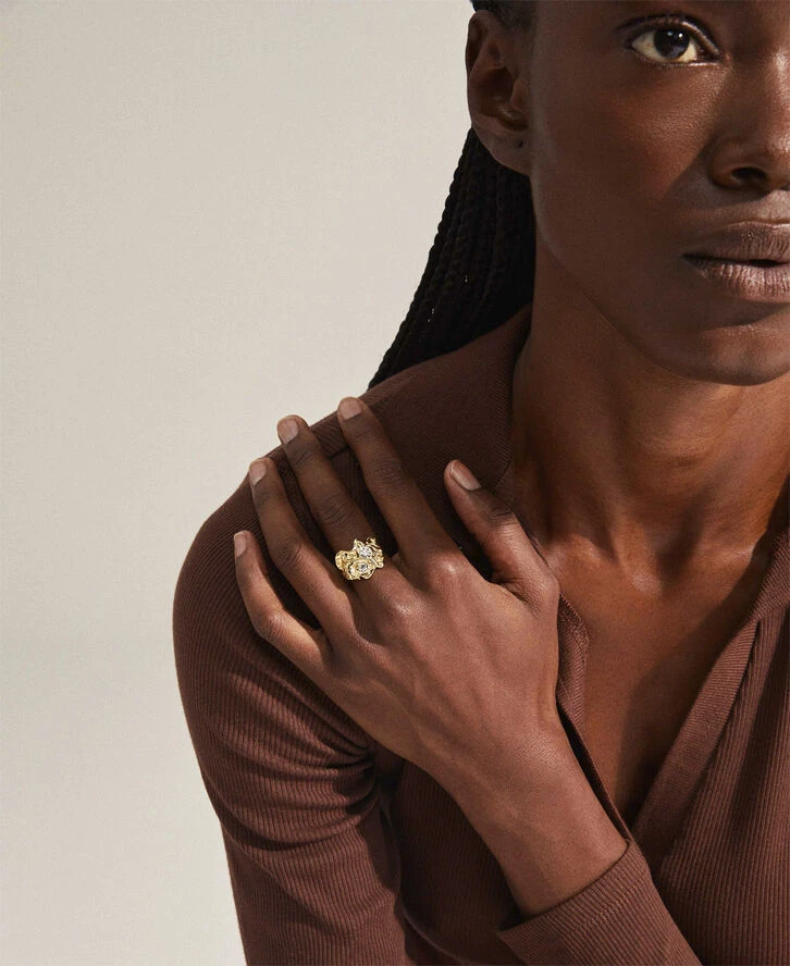 Let the energy flow med den guldbelagte ring fra Pilgrims Energetic-kollektion. Statement-ringen mixer irregulære shapes og en playful overflade med store, elegante Preciosa-krystaller. Ringen kombinerer et powerful og natural coolness med klassisk og tidløst look. Lad ringen være centerpiece for dit outfit, og style med andre tidløse vintage accessories for et fuldendt eksklusivt look.