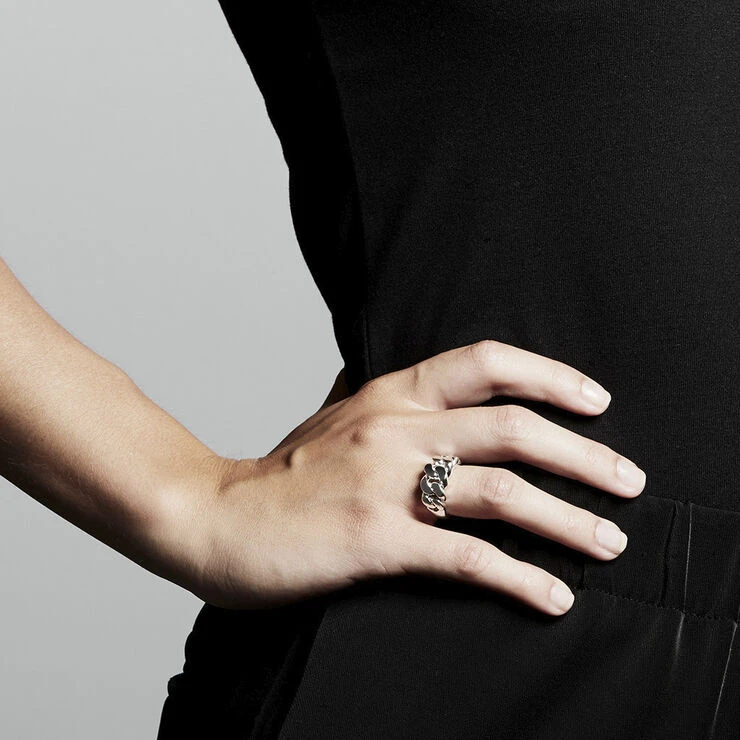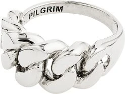 Lækker og stilfuld ring i chunky curb chain-design. Et absolut must-have item i denne sæson. Den sølvbelagte fingerring har et flettet touch med brede og smukke former, som ikke er til at overse. En sand statement-ring, der skaber fokus på din stil og tager dit look til nye højder.