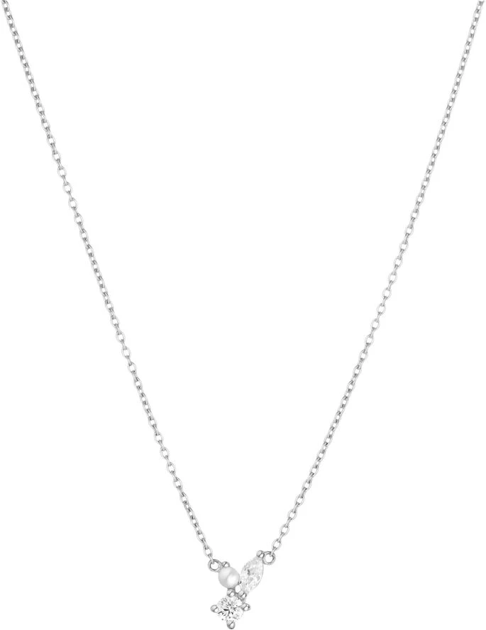 Halskæde i rhodineret sterlingsølv 925, håndsat med facetslebne hvide zirkoner og skinnende ferskvandsperle.
