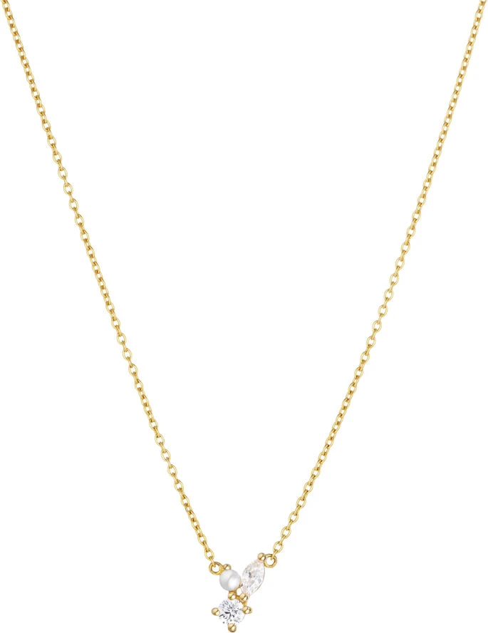 Halskæde i sterlingsølv 925, forgyldt med 18 karat guld, håndsat med facetslebne hvide zirkoner og skinnende ferskvandsperle.