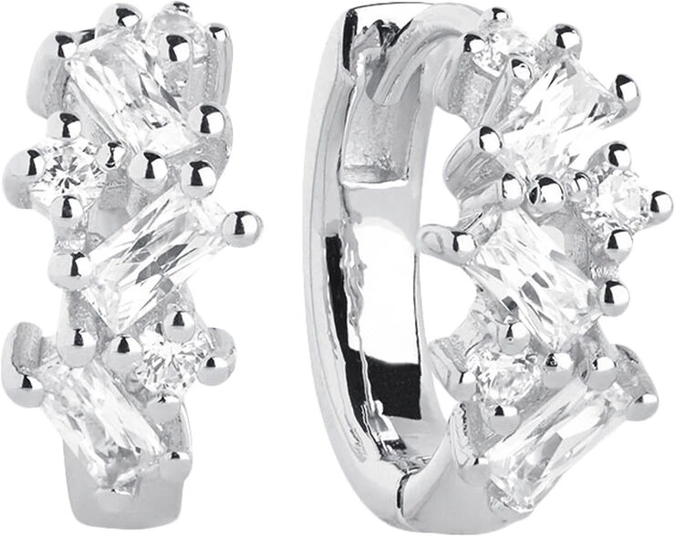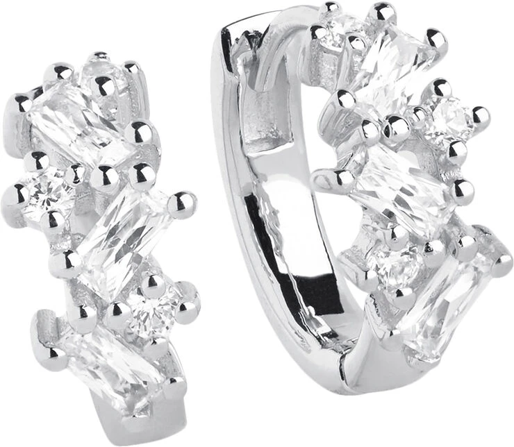Øreringe i rhodineret sterlingsølv 925 med blankpoleret overflade og en kombination af facetslebne hvide zirkoner og baguette zirkoner.