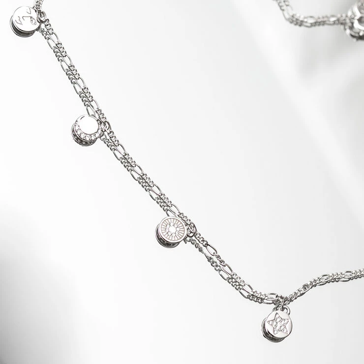 Portofino-kollektionen fra Sif Jakobs Jewellery er inspireret af medaljoner og er blevet omdannet til tidløs design med et symbolsk twist. Kollektionen appellerer til enhver kvinde med en kærlighed til smykker. Det er en blanding af klassiske stykker til hverdagsbrug, trendy pieces med mindre charme og symbolske referencer samt avantgarde statement øreringe fyldt med gnistre og glans. Halskæde i rhodineret sterlingsølv 925 med blankpoleret overflade og facetslebne hvide zirkoner.