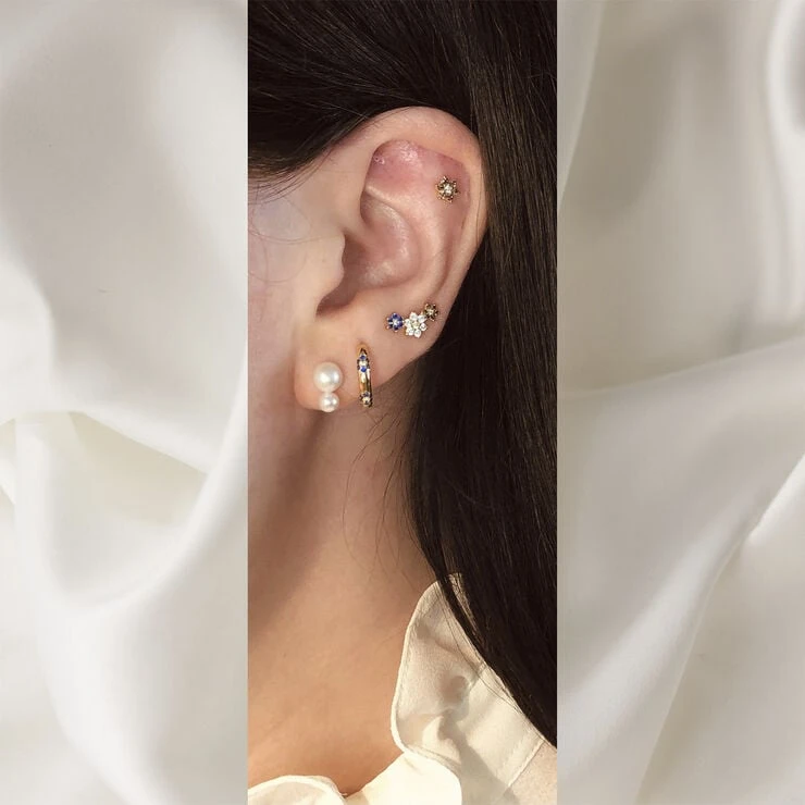 Lille ørestik med blomst med rhodolit farvede og en klar sten. Sælges enkeltvis.